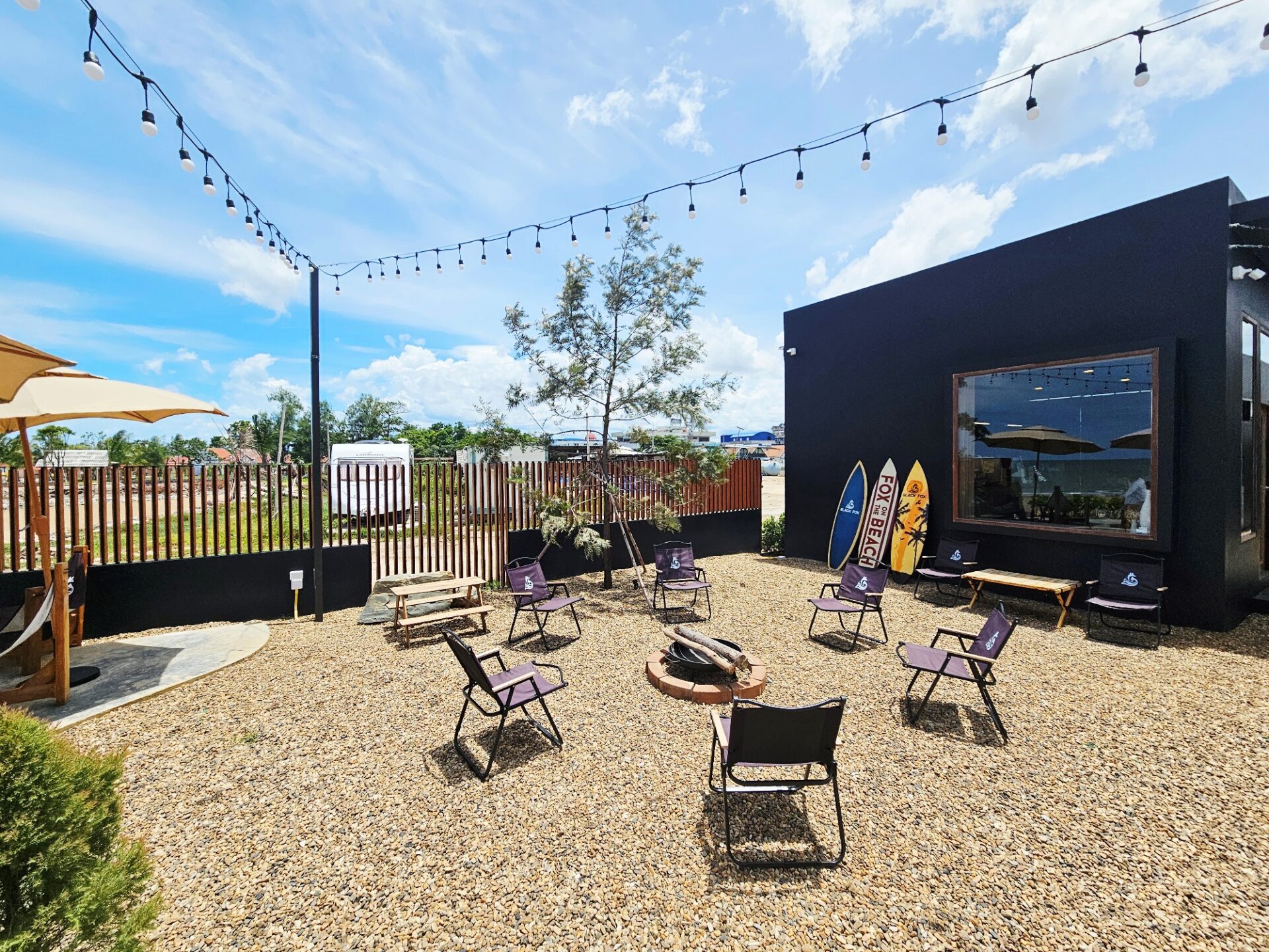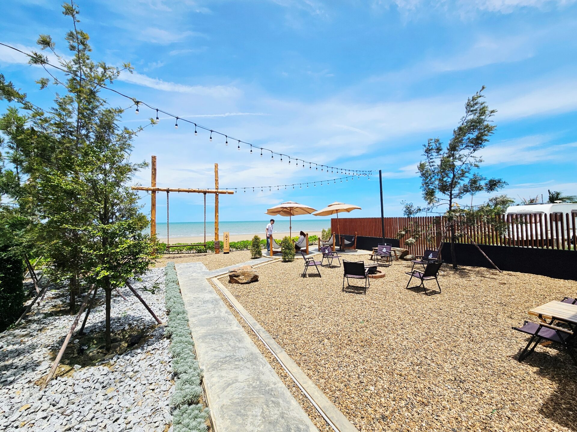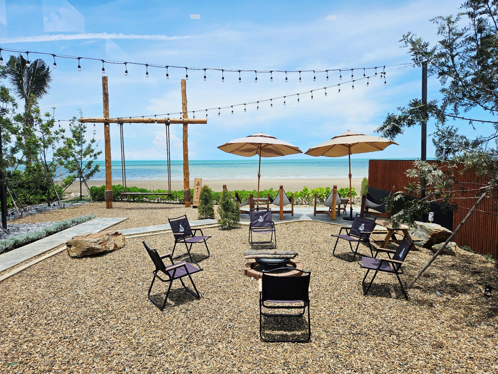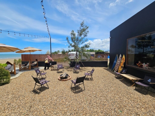 โซน Outdoor ด้านนอก เป็นที่นั่งสไตล์ Camping บนสวนหินริมทะเล หาดทรายยาวสวย